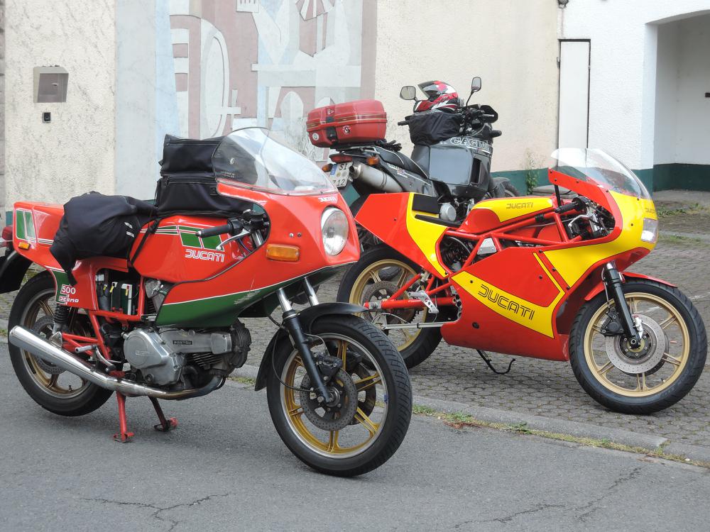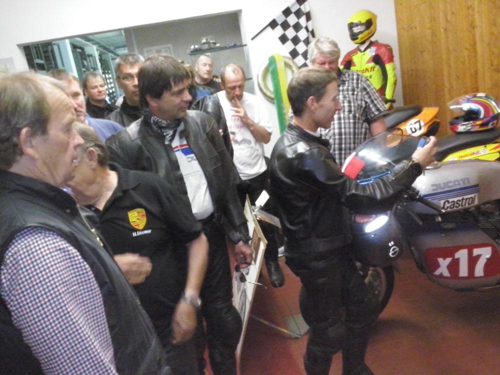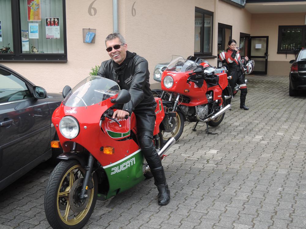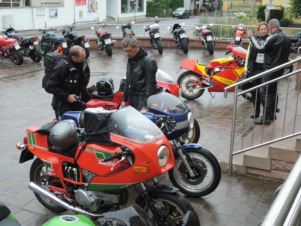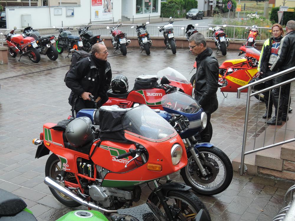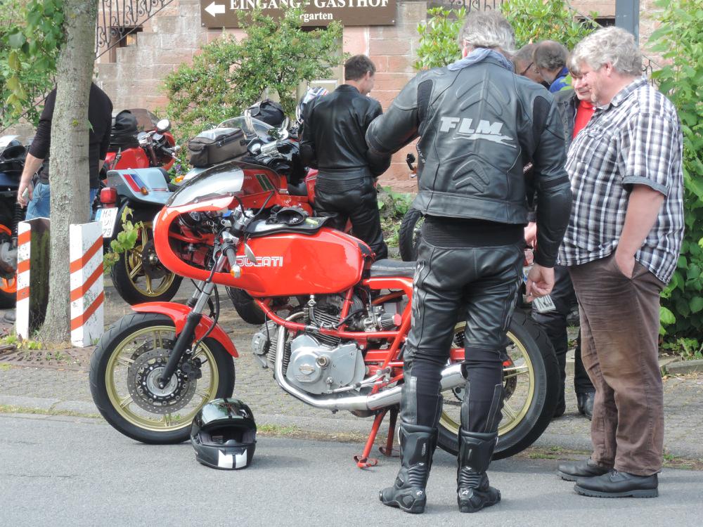 Der Samstag war leider so feucht, dass die geplante Ausfahrt nur stark verkürzt stattfand. Höhepunkt war der Besuch bei Zweirad Röth, die Führung von Fritz Röth durch sein Museum gab einen guten Eindruck über die doch recht wechselhafte Ducati-Geschichte – offensichtlich hat er sich sehr über die vielen Pantahs und auch zwei Königswellen auf seinem Hof gefreut. Nach dem Mittagessen wurde dann die Ausfahrt wegen andauerndem Regen beendet. Erst am späten Nachmittag kam dann wieder die Sonne raus und die nun guten Straßenverhältnisse wurden für Ausfahrten in kleiner Gruppen genutzt – das hat sehr für den verregneten Vormittag und Mittag endschädigt. Der Abend ging mit einer Grillveranstaltung zu Ende.
