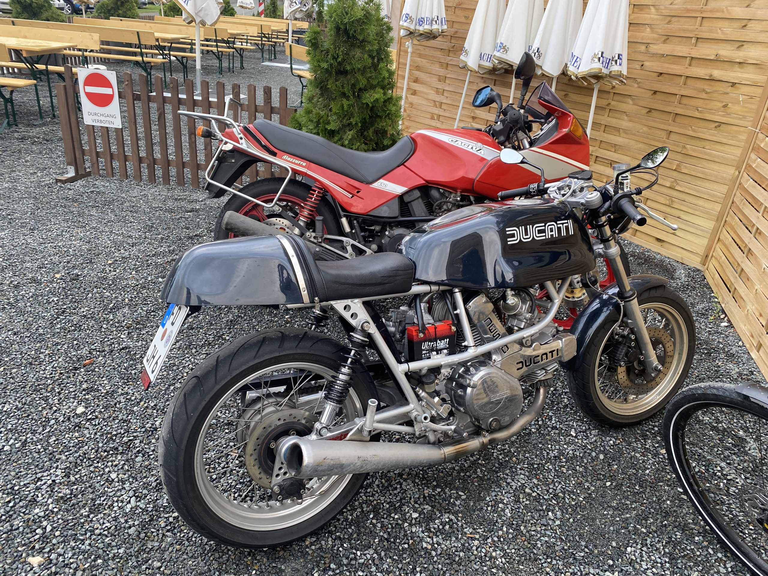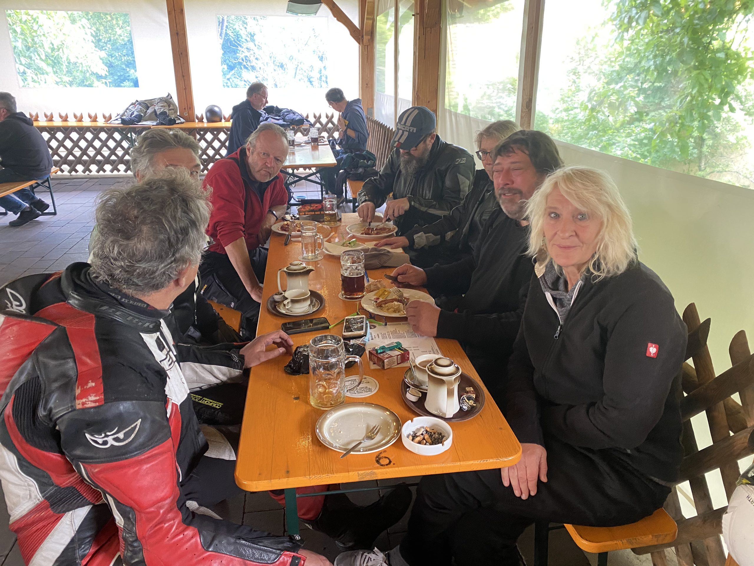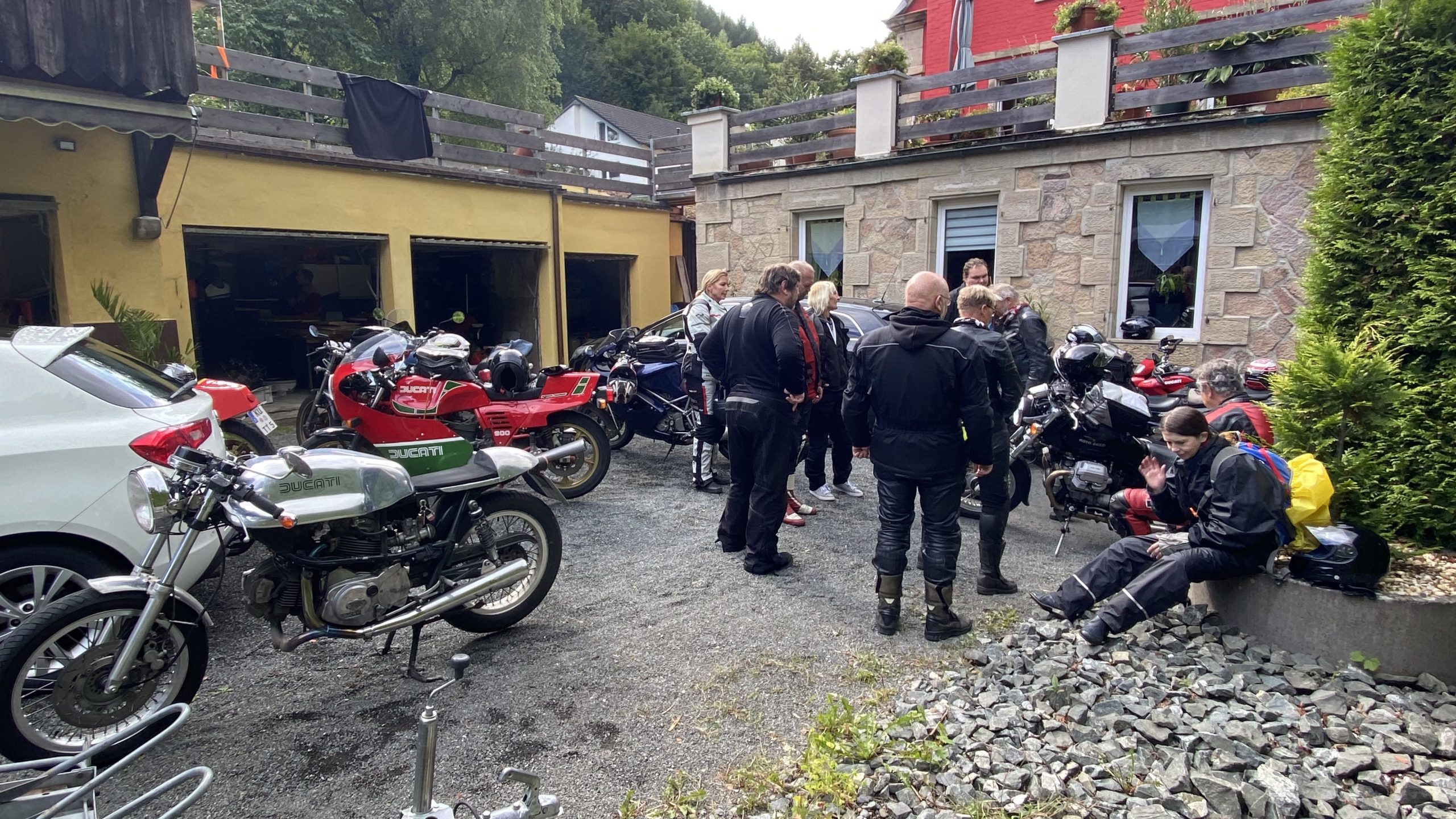Am Samstag ging es frisch gestärkt von einem super Frühstück los. Der erste Stop war eine Foto Pause bei Michas Schwester. Hier noch mal vielen, vielen Dank für die Fotos die du gemacht hast. Klasse. Wir teilten uns zur Ausfahrt dann in zwei Gruppen auf. Eine langsamere und eine schnellere Gruppe. Bunt gemischt mit Pantahs, TTs, Königswelle, Cagiva und anderen. Die schnellere Gruppe wurde vom Ausrichter Michael angeführt und Kumpel Logge als Sammler abgeschlossen. Die langsamere Gruppe wurde von Jacky und Udo angeführt und Frank als Sammler abgeschlossen. An dieser Stelle noch mal vielen Dank Micha, Jacky und Udo für die tolle Tour durch die fränkische Schweiz. War wirklich ganz Klasse. Das Wetter hat gehalten. Der Mittags Stop war im fränkischen bei der Kathi Bräu auch hervorragend. Am Abend kamen noch der ein oder andere Tagesbesucher. Frisch gestärkt gab es dann den Abend bei Bier und Schnaps ein geselliges Miteinander. Tolle Gespräche und viel zu lachen gab es in der Weinbrücke. Es passte alles.