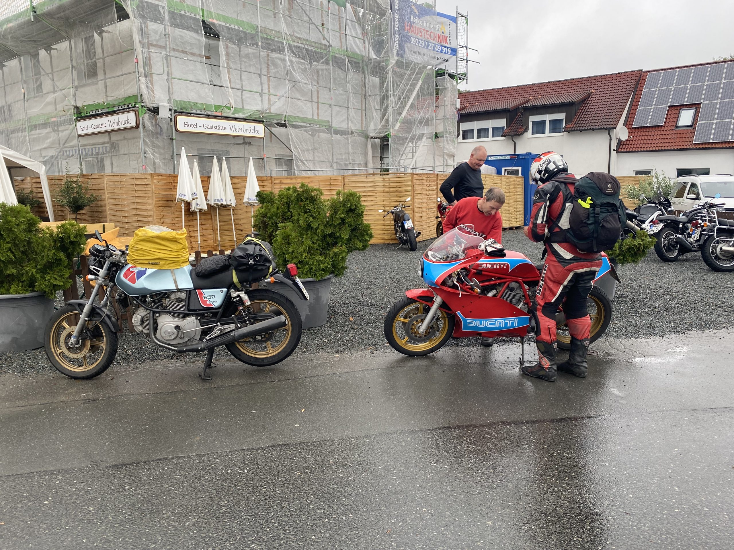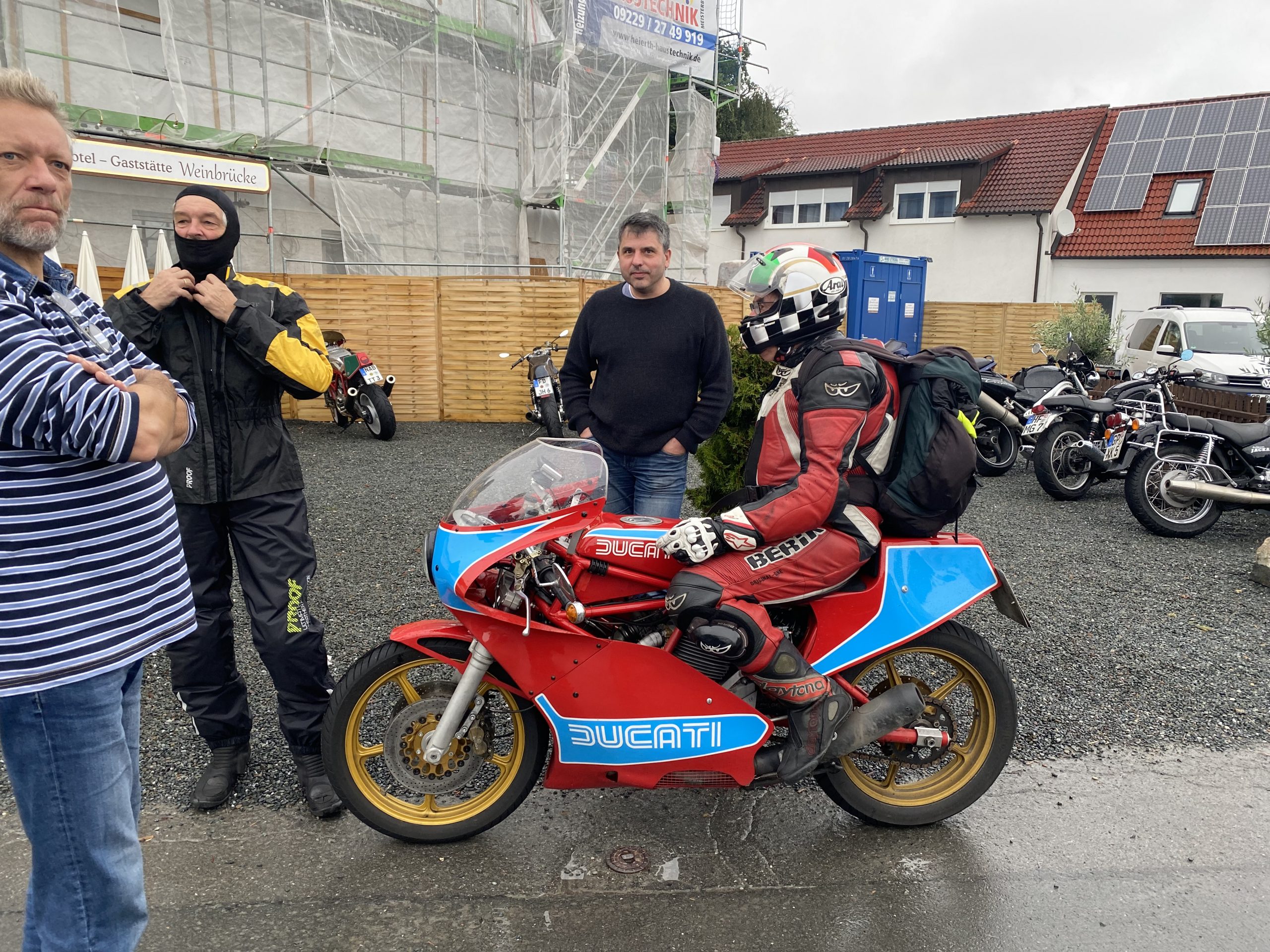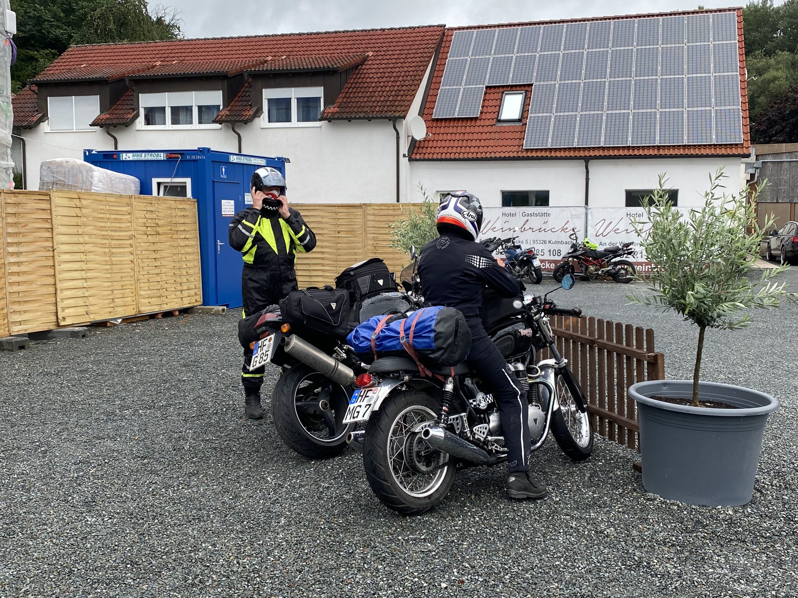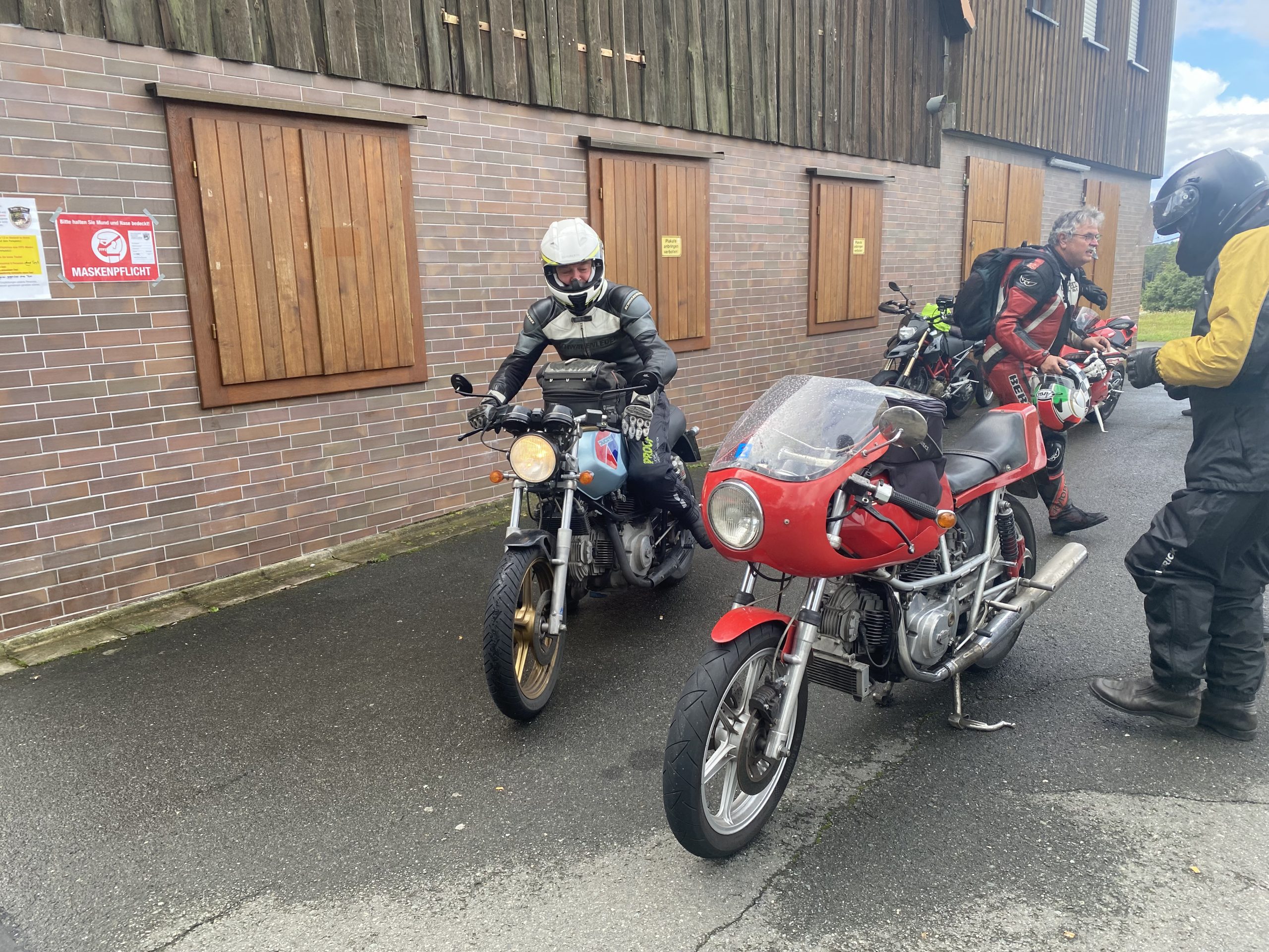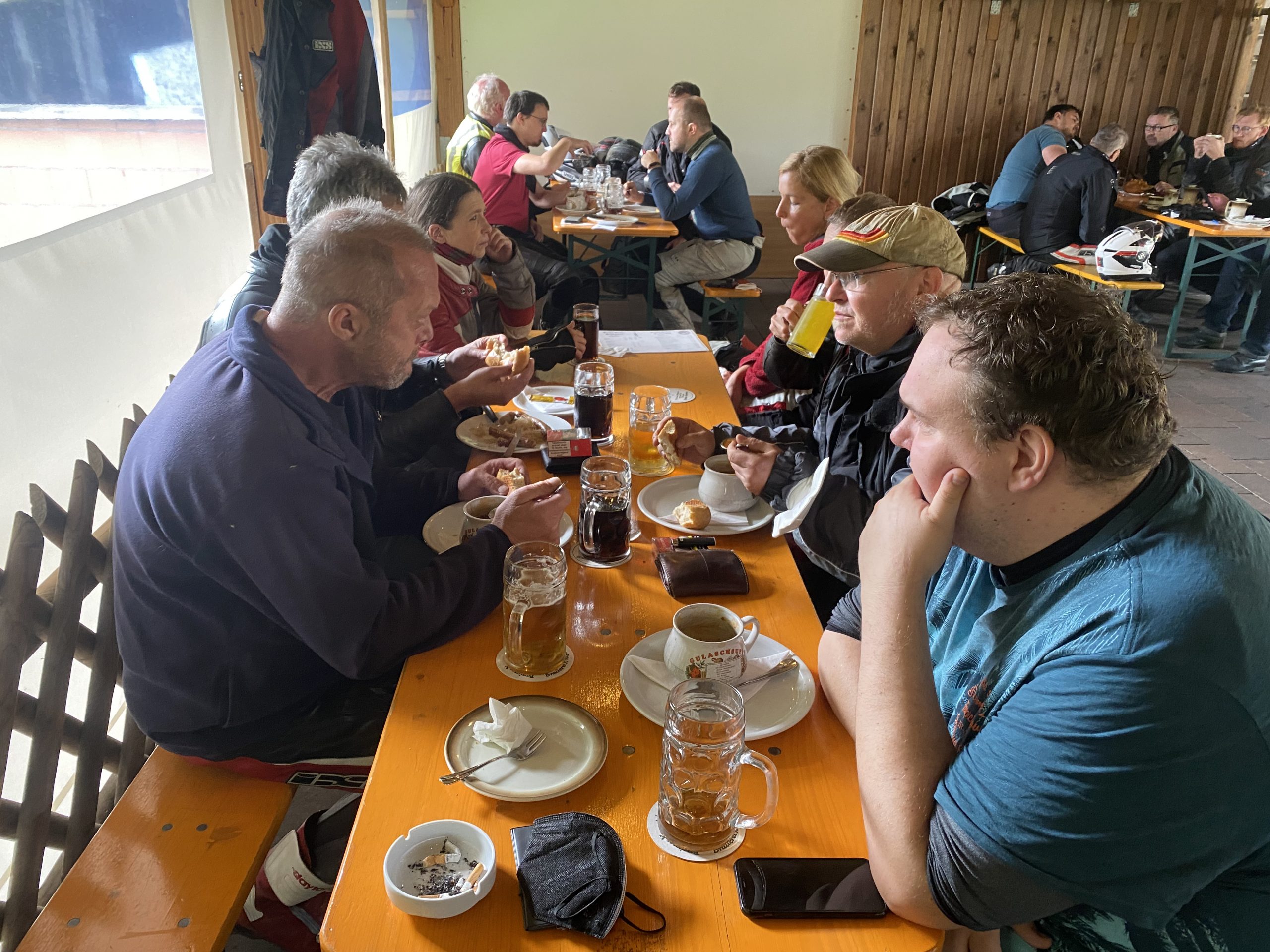 Später trafen so nach und nach die ersten in der Weinbrücke in Kulmbach ein. Das kleine Hotel hatte frisch renovierte Zimmer und lag wunderschön. Wir wurden freundlich von den Gastleuten empfangen – vielen Dank an dieser Stelle. Wir wurden über die ganze Zeit hervorragend betreut. Weinbrücke top top top. Essen trinken morgens abends war immer klasse. Am Abend war bei geselligen Zusammensein genügend Zeit für Benzin Gebabbel. Der ein oder andere kam erst relativ spät und in nassen Klamotten. Leider hat es einer nicht geschafft. Klaus das nächste mal biste wieder dabei!