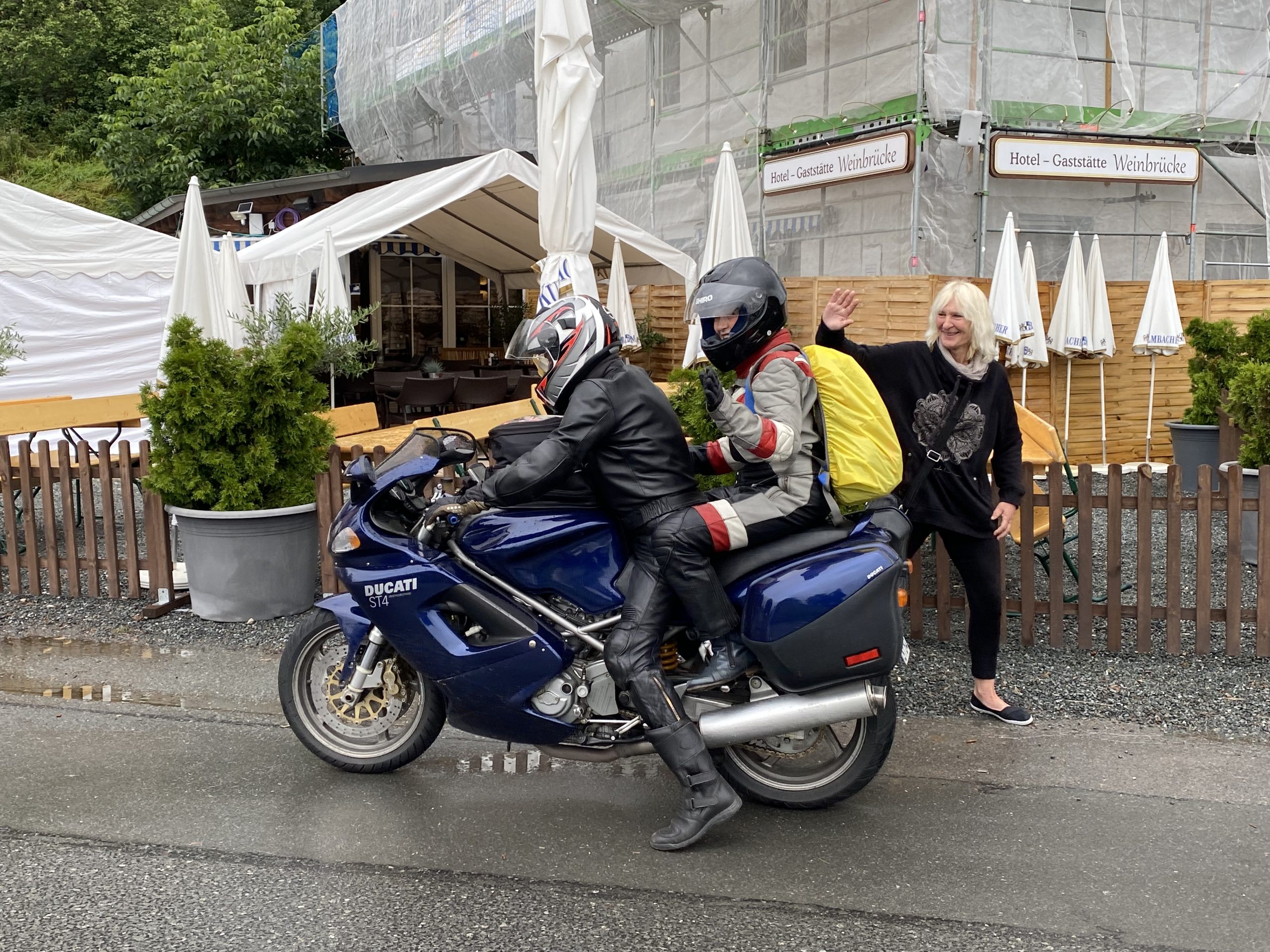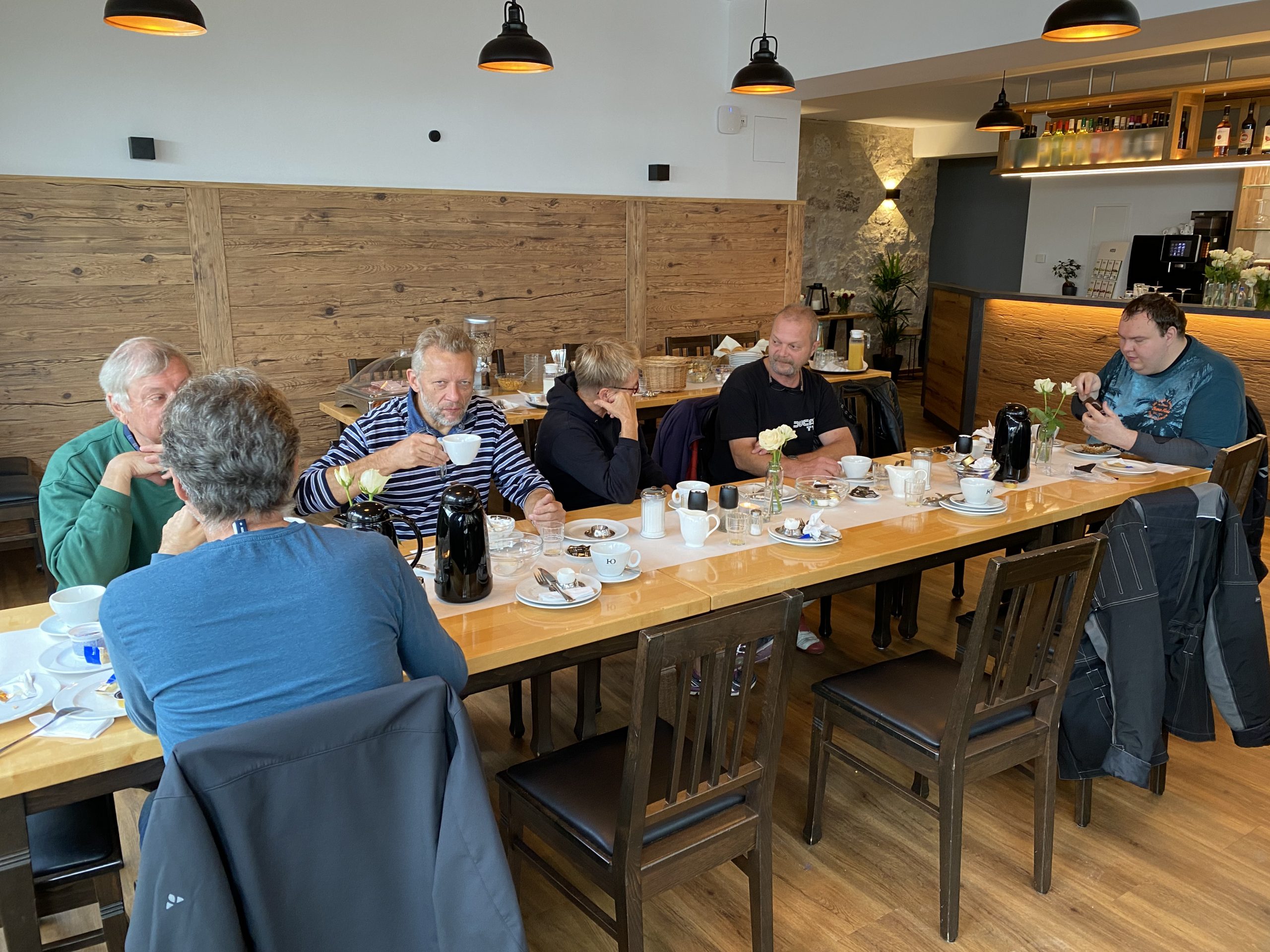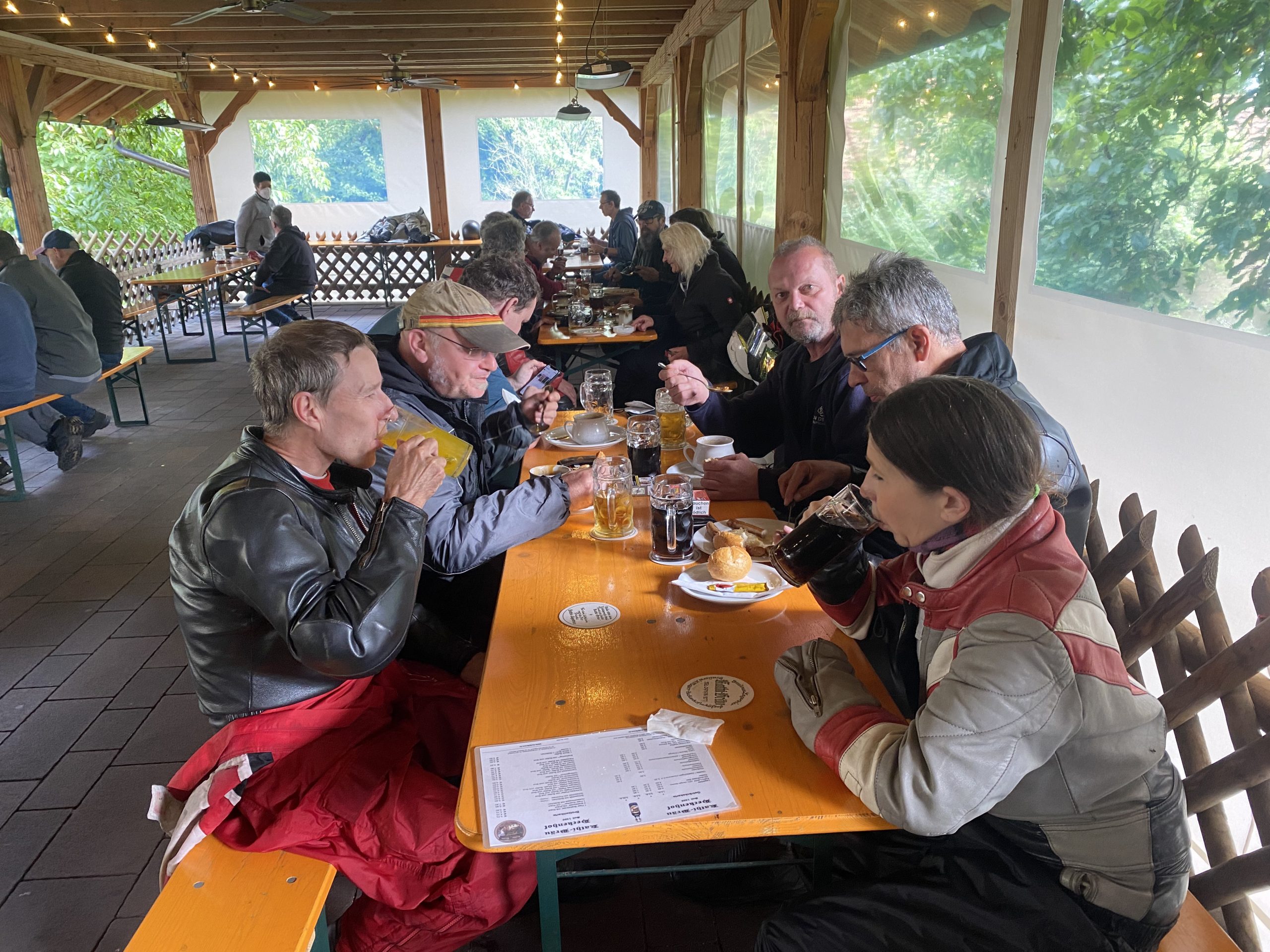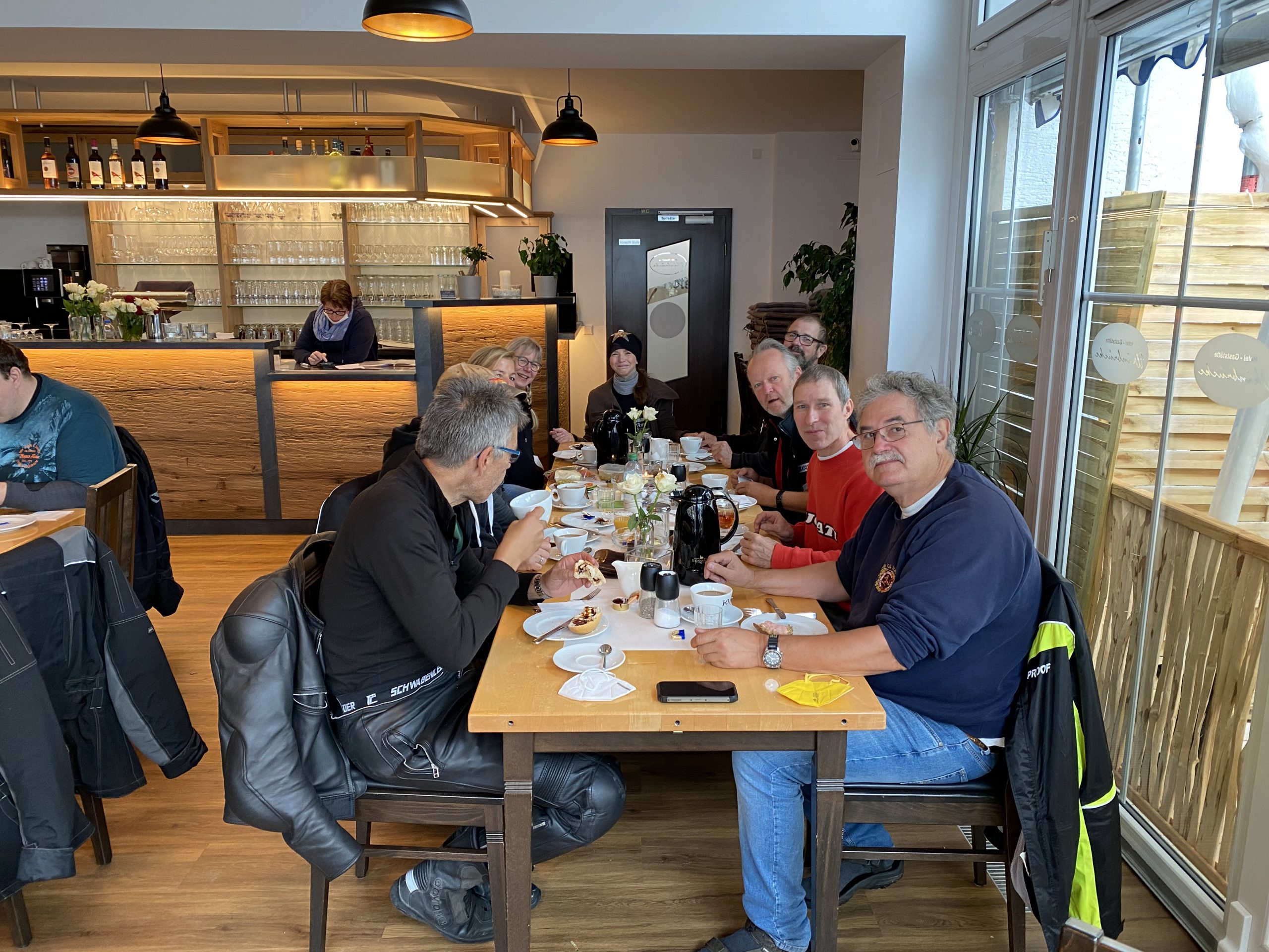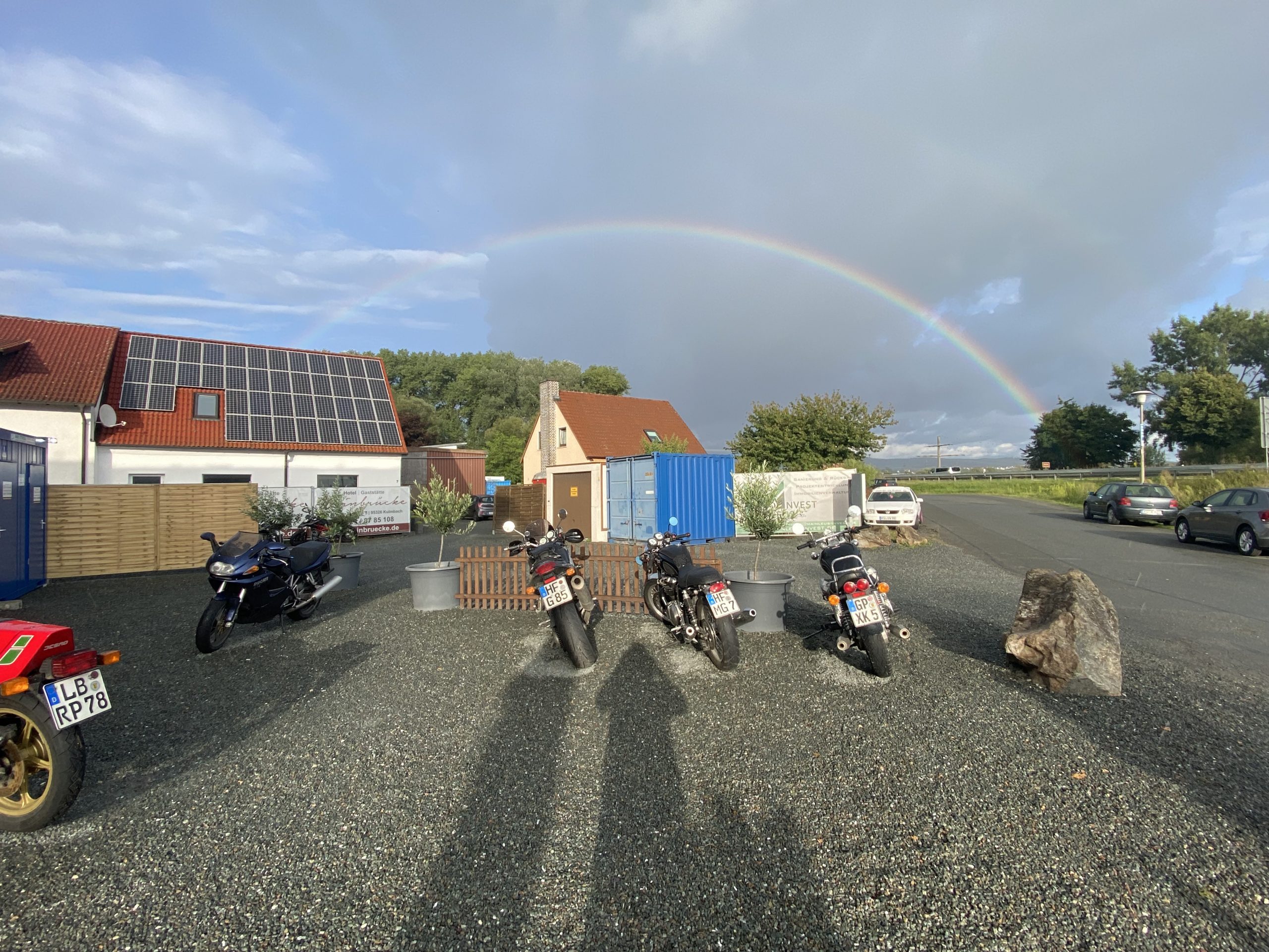 Später trafen so nach und nach die ersten in der Weinbrücke in Kulmbach ein. Das kleine Hotel hatte frisch renovierte Zimmer und lag wunderschön. Wir wurden freundlich von den Gastleuten empfangen – vielen Dank an dieser Stelle. Wir wurden über die ganze Zeit hervorragend betreut. Weinbrücke top top top. Essen trinken morgens abends war immer klasse. Am Abend war bei geselligen Zusammensein genügend Zeit für Benzin Gebabbel. Der ein oder andere kam erst relativ spät und in nassen Klamotten. Leider hat es einer nicht geschafft. Klaus das nächste mal biste wieder dabei!